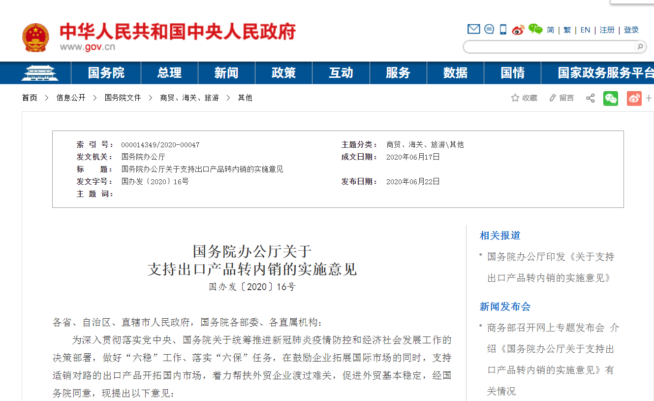 6月22日,國務(wù)院辦公廳發(fā)布了關(guān)于支持出口產(chǎn)品轉(zhuǎn)內(nèi)銷的實施意見,旨在鼓勵企業(yè)拓展國際市場的同時,支持適銷對路的出口產(chǎn)品開拓國內(nèi)市場,著力幫扶外貿(mào)企業(yè)渡過難關(guān),促進(jìn)外貿(mào)基本穩(wěn)定。