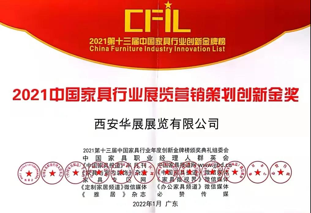近日,西安國際家具展承辦方西安華展展覽有限公司分別榮獲2021第十三屆中國家具行業(yè)展覽營銷策劃創(chuàng)新金獎和中國家具行業(yè)40年成就展覽服務(wù)獎。